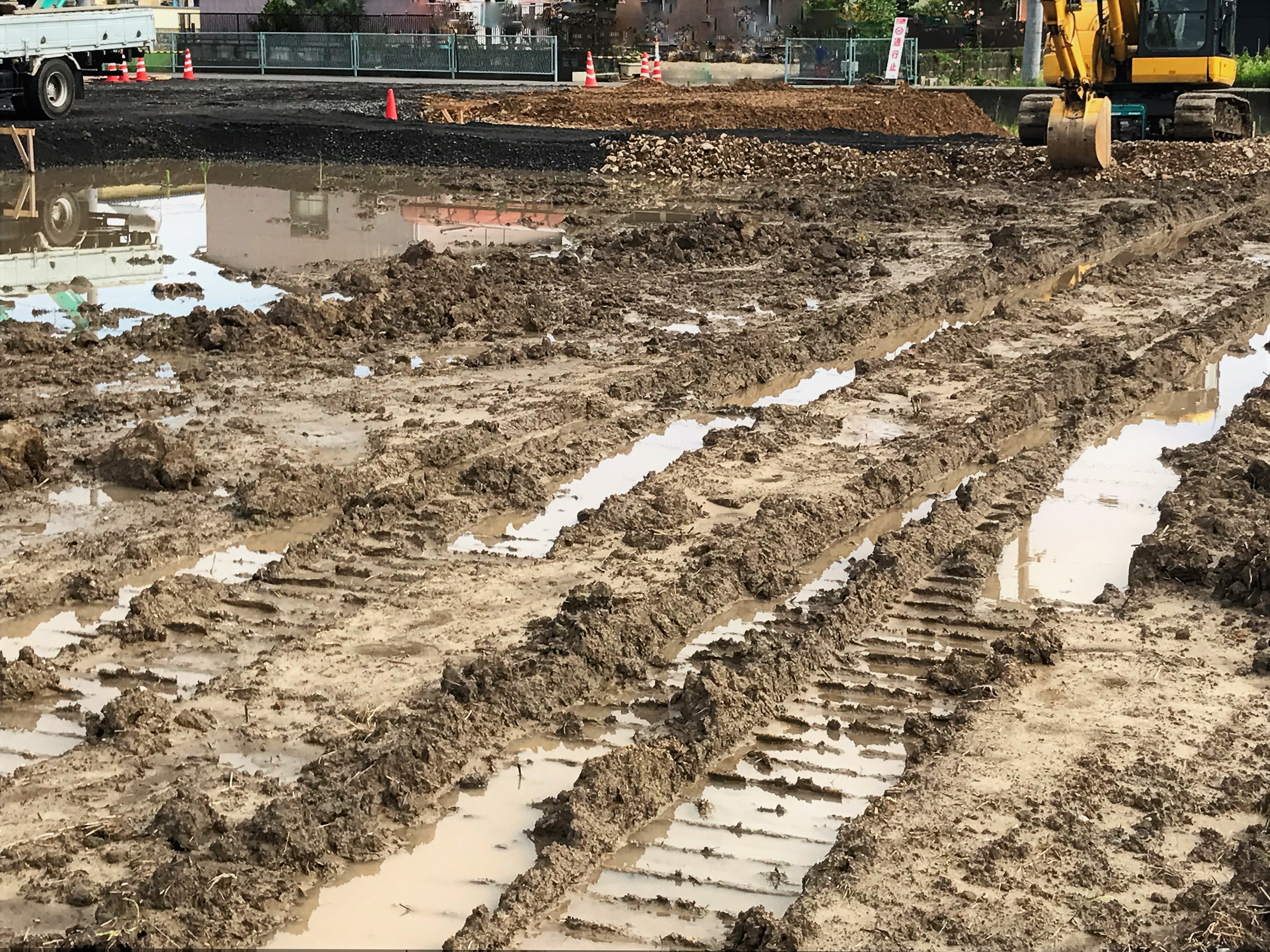 土と違い、水によって形状が崩れにくく水捌けも良いので、作業中雨が降り出した場合にも、締め固め作業が続行できます。