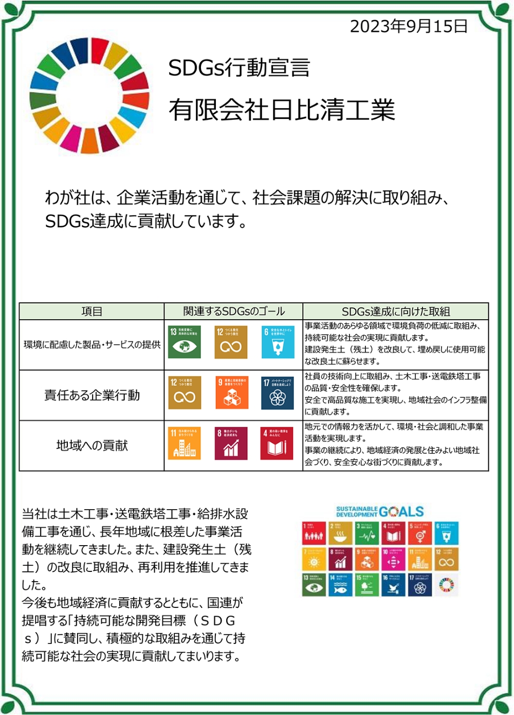 当社は土木工事・送電鉄塔工事・給排水設備工事を通じ、長年地域に根差した事業活動を継続してきました。 また、建設発生土(残土)の改良に取組み、再利用を推進してきました。