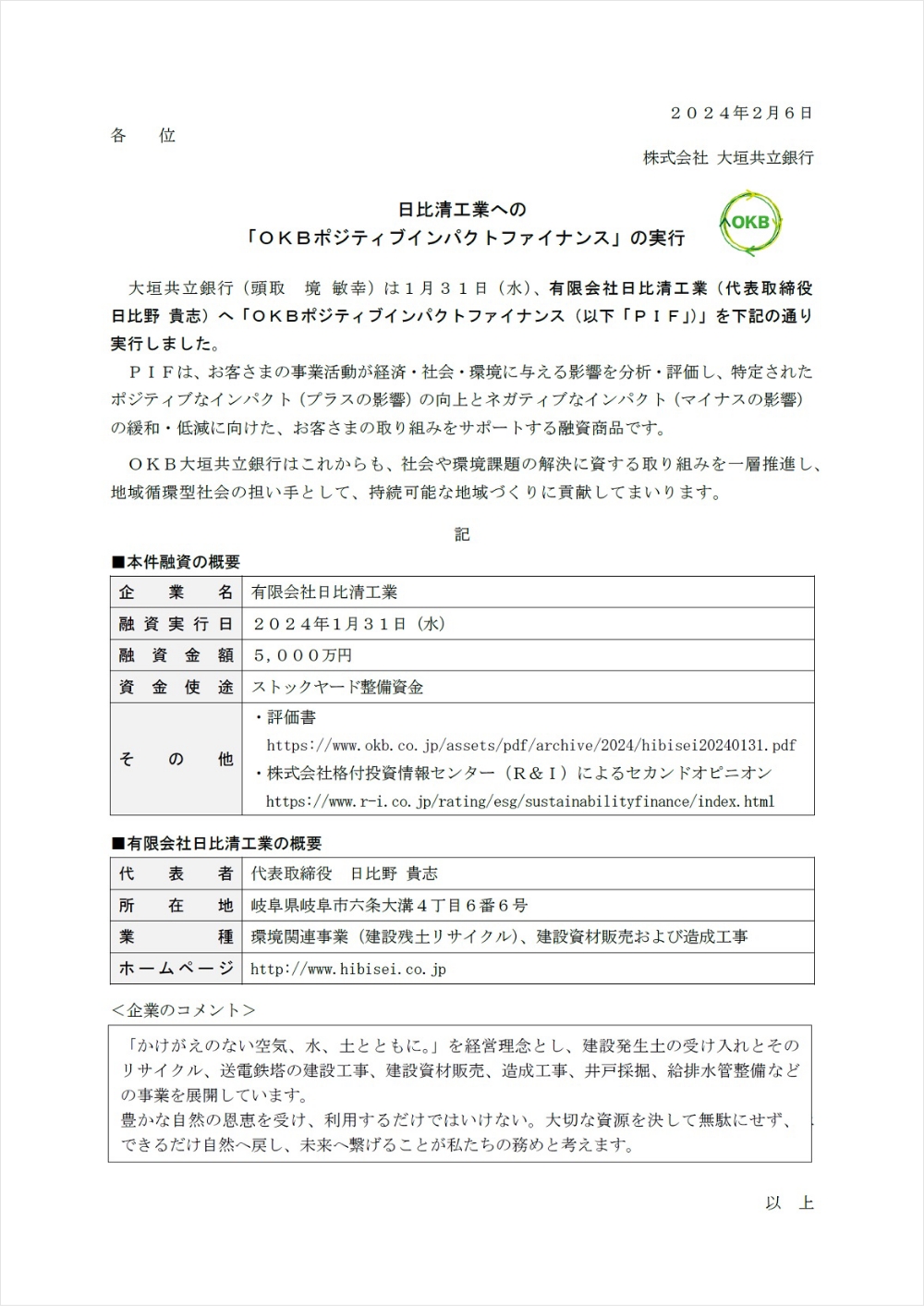 この度、弊社に対して大垣共立銀行様が実施する中小企業向けのポジティブ・インパクト・ファイナンスについて、SDGsの目標達成に向けた企業活動などをOKB総研様に分析・評価していただきました。