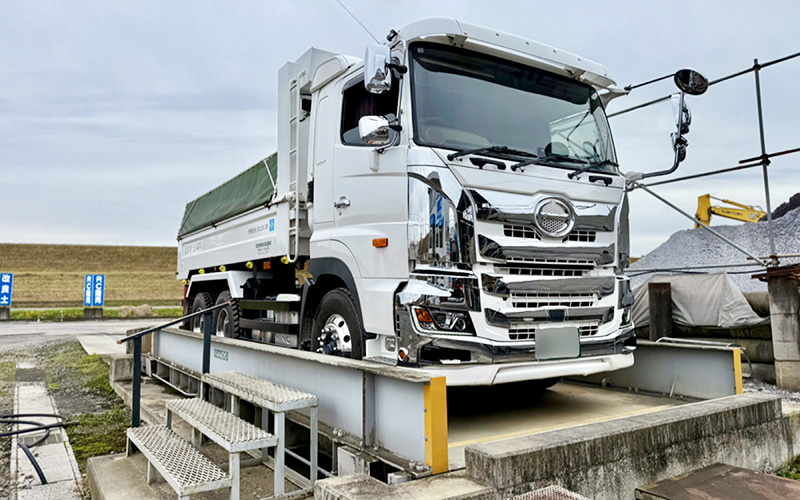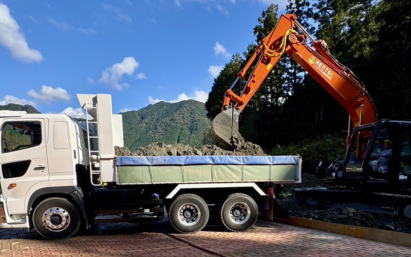 現場から搬入された発生土は、トラックスケールに乗ることで車両番号・積載量・搬入日時・発生元などを記録しています。